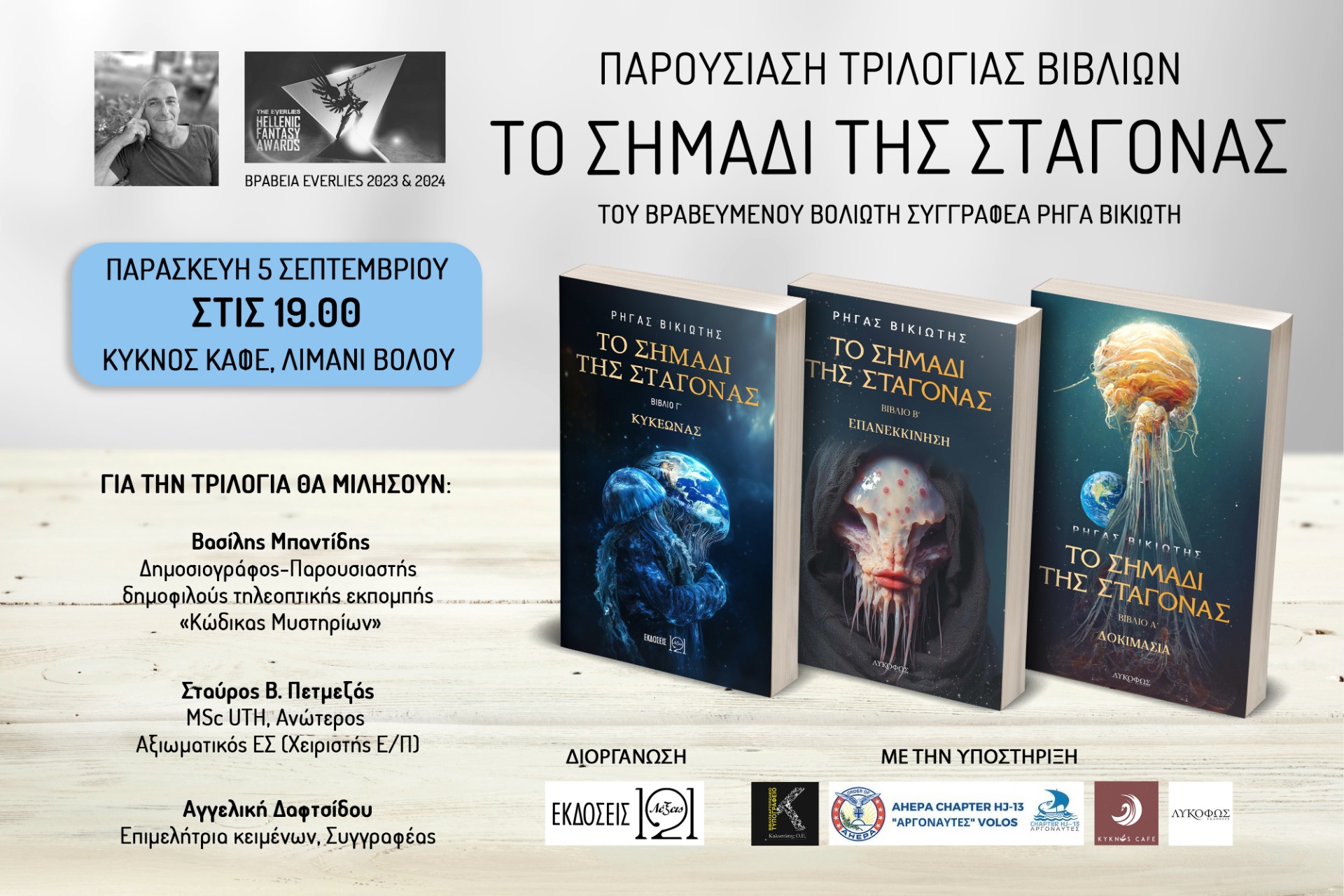 Με χαρά σας προσκαλούμε στην παρουσίαση της τριλογίας «Το σημάδι της σταγόνας», που θα πραγματοποιηθεί την Παρασκευή 5 Σεπτεμβρίου και ώρα 19.00 στο καφέ Κύκνος, στο λιμάνι του Βόλου.Για την τριλογία θα μιλήσουν ο Βασίλης Μπαντίδης, Δημοσιογράφος-Παρουσιαστής δημοφιλούς τηλεοπτικής εκπομπής «Κώδικας Μυστηρίων», ο Σταύρος Β. Πετμεζάς, ΜSc UTH,...